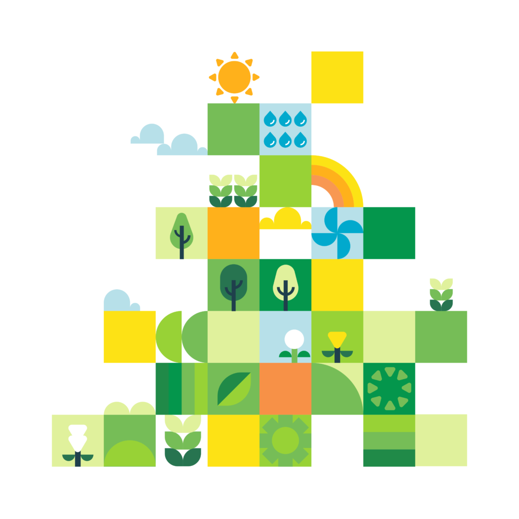 Source: Blocks of green, yellow, and blue plants, clouds, sun and water.