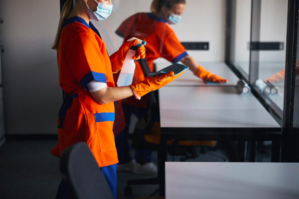 Source – Alt: A commercial cleaning team in orange works on an office room