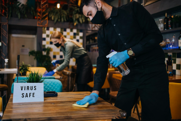 Source – Alt: A restaurant server disinfects and wipes down a table with a sign on it that reads “Virus Safe”